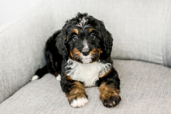 Bernedoodles come in a variety colors such as Black Tri, Bi-Black, and Sable. We focus mainly on Phantom and Tri colors. Tri Bernedoodles are Black and White with copper trim along their face and/or legs, and above the eyes. Phantom Bernedoodles are Black with copper trim along their face, legs, chest, and above the eyes. Please see our DOODLE COLORS page for more info on different coloration and patterns.